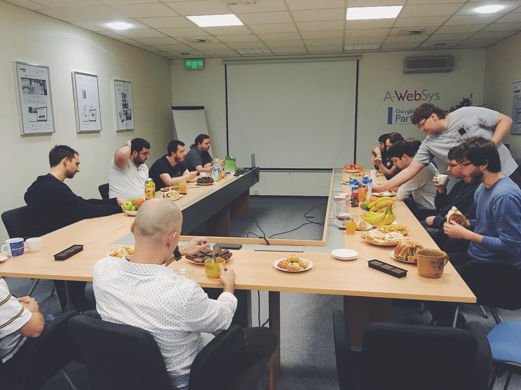 Před obědem máme většinou úvodní zaškolení za sebou a vyrážíme na Tour de A-WebSys. Začínáme na recepci u asistentky Peťky, se kterou se obyčejně všichni seznámí už na pohovoru, ale v nástupní den ještě raději připomínám, s čím se na Peťu obrátit a co přesně dělá. Pokračujeme do kuchyňky, která je po recepci snad druhá nejdůležitější sekce našich kanceláří, je tam kafe, ovoce a sladkosti. A ty samozřejmě všichni moc potřebujeme. :)V kuchyňce si řekneme, kde co je, jak udělat tu nejlepší kávu a co všechno je možné vyčíst z naší nástěnky. Následuje exkurze do kanceláře jednatele Davida, místnosti s tiskárnou a představování kolegů. Počítáme s tím, že první den si jich nováček moc nezapamatuje, to je normální. Známe to všichni!